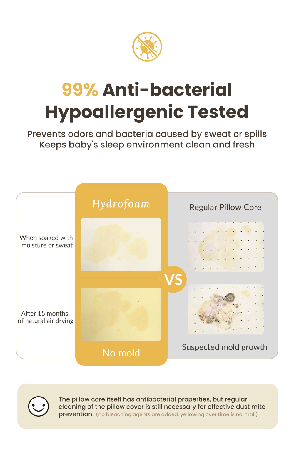Yellowing: This product does not contain anti-yellowing agents. It is a natural phenomenon for the foam to turn yellow over time; this does not affect the performance of the product.