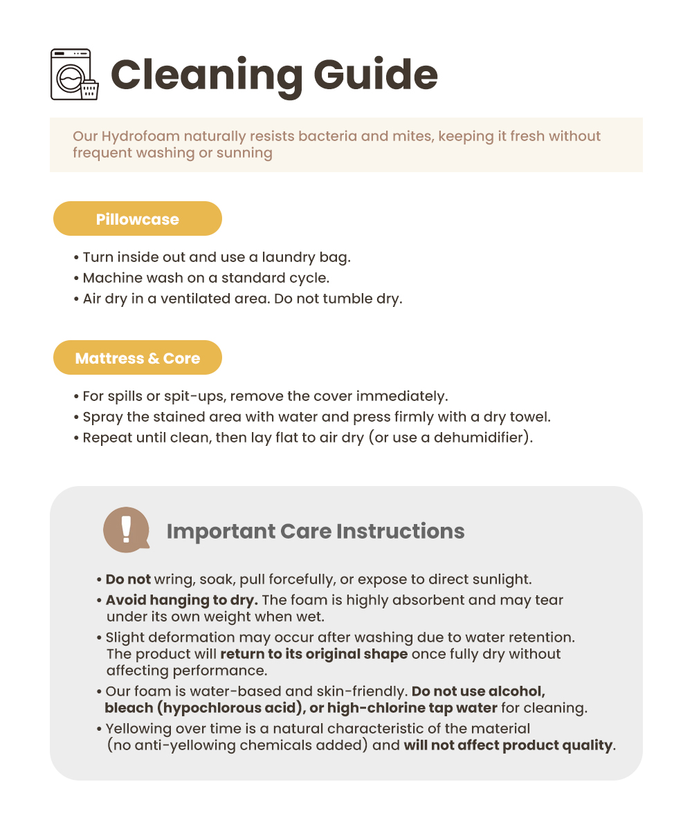 The mattress foam is water-foamed and is a skin-friendly high-tech product. Do not use alcohol, hypochlorous acid water, or tap water with high chlorine content for cleaning.